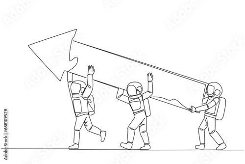 Single one line drawing three astronauts raised the big arrow together. With teamwork making graphics can improve. Deep space astronaut concept. Cosmonaut. Continuous line design graphic illustration