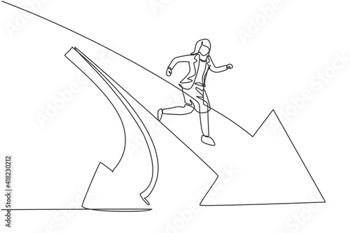 Single one line drawing young smart business woman running on crossroads an choose straight way. Business sales growth minimal concept. Modern continuous line draw design graphic vector illustration
