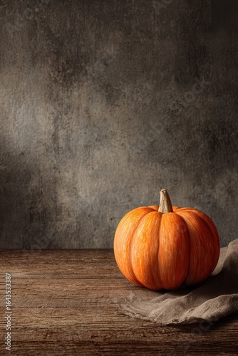 Single Orange Pumpkin on Rustic Wooden Table with Burlap Cloth, Dark Moody Background