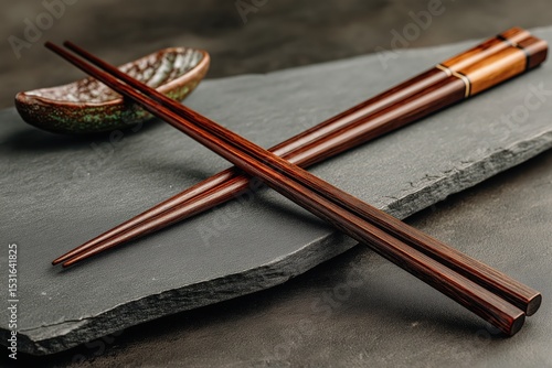 Single Pair Of Chopsticks Resting Neatly On Slate In Soft Light