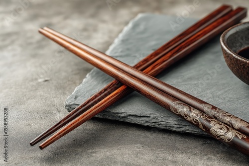 Single Pair Of Chopsticks Resting Neatly On Slate In Soft Light