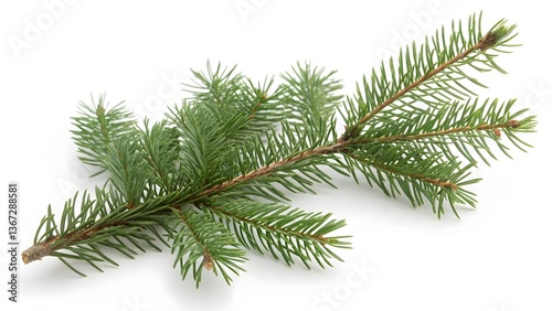 Single Pine Branch with Short Sharp Needles, Isolated on a White Background, symbolizing purity and tranquility, Professional Winter Holiday Decoration Stock Photo