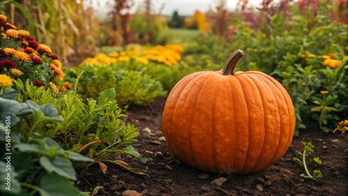Single ripe orange pumpkin resting in a garden bed surrounded by autumn flowers