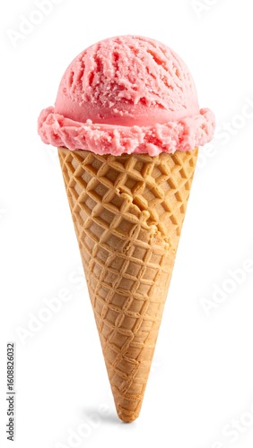 Single scoop of pink ice cream in a waffle cone, isolated on white