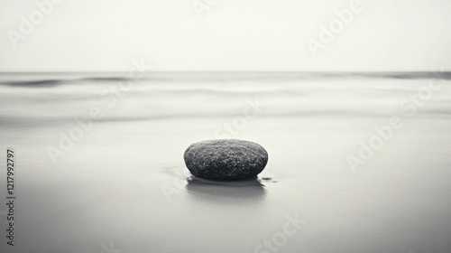 Single smooth grey stone on wet sand beach, blurred ocean background.