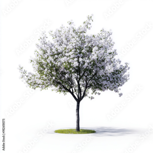 Single tree in full bloom with white flowers, isolated on a clean white background.
