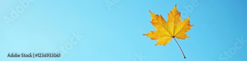Single yellow autumn leaf placed against a clear blue sky background, simple, clear