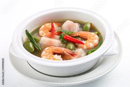Sinigang, sour soup from Philippines made with shrimps, tamarind, tomatoes and onions AI generative Filipino dish.