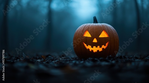 Sinister Jack-o'-Lantern in Haunted Forest with Stormy Sky - Spooky Halloween Concept with Copy Space, Selective Focus, and Ultra HD Quality