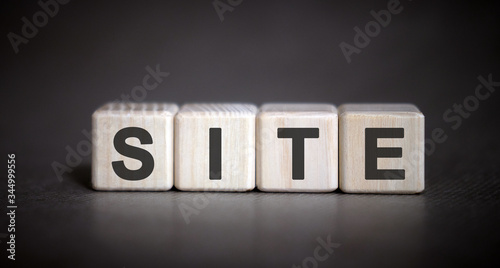 Site text on wooden cubes on a dark gray background