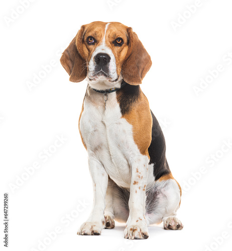 Sitting and looking at the camera a Beagle dog wearing a dog collar, Isolated on white