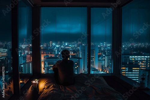Sitting by the window at night One man, modern man sitting on bad by the window at night