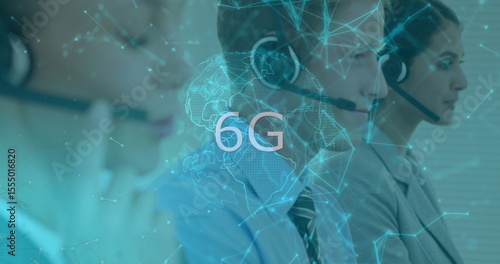 Sitting three agents wearing headsets and suits handling calls at office with digital 6G overlay