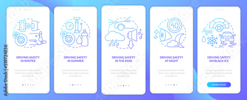 Situational driving safety blue gradient onboarding mobile app screen. Walkthrough 5 steps graphic instructions with linear concepts. UI, UX, GUI template. Myriad Pro-Bold, Regular fonts used