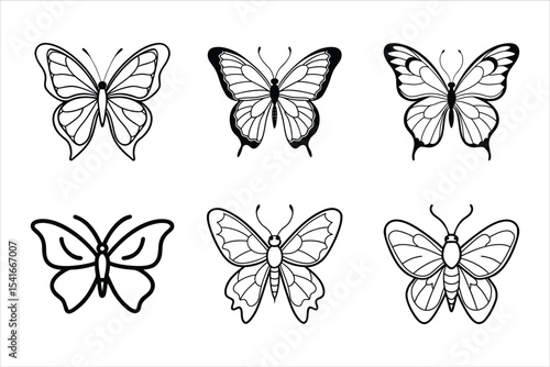 Six Black Line Art Butterfly Designs White Background