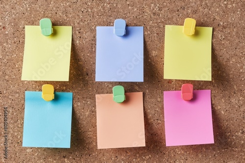Six blank pastel-colored post-it notes are pinned neatly to a brown cork board