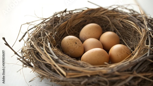 Six Brown Eggs Nestled Comfortably in a Bird s Nest on a White Background
