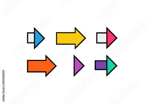 Six colorful arrows, various shapes and directions, on a black background. Arrows are simple, geometric shapes. Different colors including orange, yellow, and purple