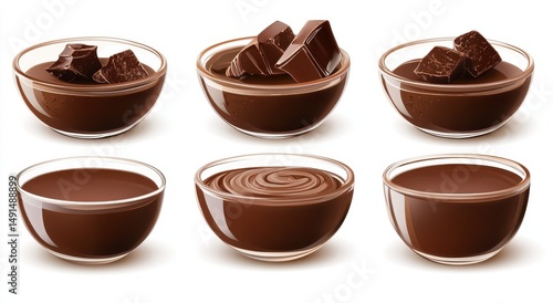 Six glass bowls filled with different variations of rich, decadent chocolate. Some bowls contain chunks of chocolate, while others showcase smooth, melted chocolate.