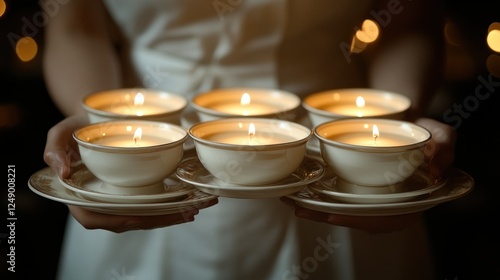 Six Lit Candles in Elegant Bowls, Warm Atmosphere
