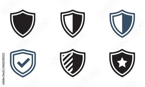 Six Shield Icons in Black and Blue with Different Designs on White Background security protection