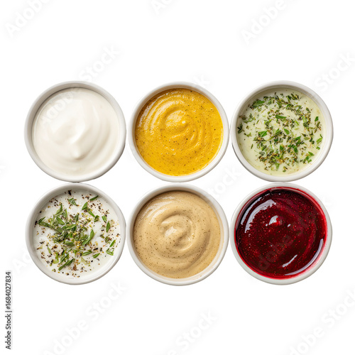 Six small white bowls filled with various sauces, condiments, or dips. A top-down view shows creamy white, mustard yellow, light green, tan, and reddish-purple sauces, each with various toppings