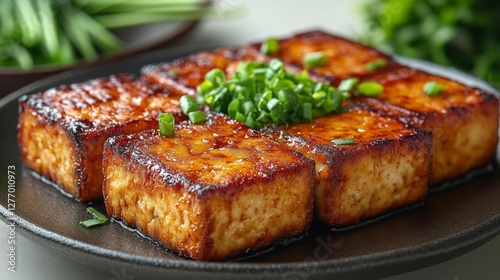 Sizzling Grilled Tofu Cubes with Fresh Scallions. Generative AI