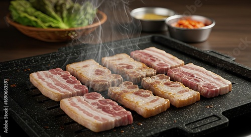 Sizzling pork belly slices on a grill plate steam rising Bowls with condiments and lettuce basket complete the meal