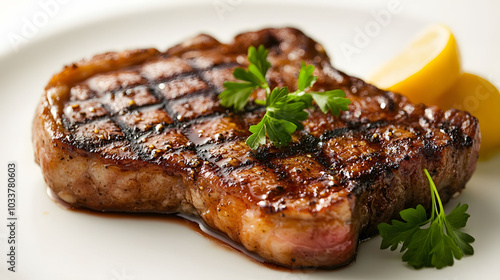 Sizzling Steak Delight, A beautifully presented pan seared steak showcasing rich textures and vibrant colors against a clean backdrop