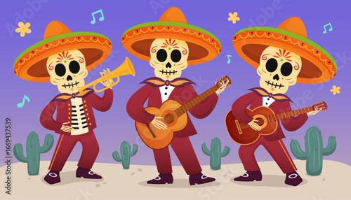 Skeleton musicians in colorful outfits joyfully play instruments during Dia de Muertos celebration.