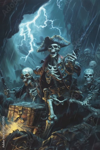Skeleton Pirates Wielding Rusted Cutlasses in Thunderstorm Scene