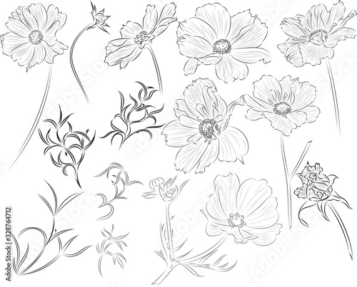 Sketch flowers, buds and leaves of cosmea. Vector image of an imitating pencil drawing.