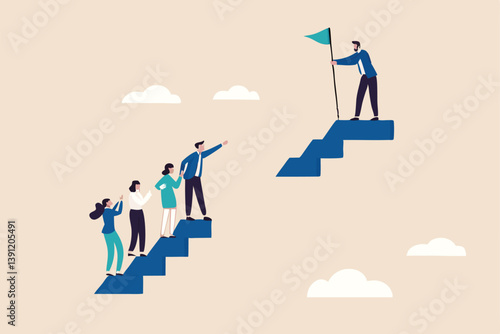 Skill gap, employee difficulty or difference knowledge, competence or career problem, talent obstacle or opportunity challenge concept, business people climb up stair to find sill gap to reach goal.