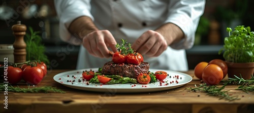 Skilled chef creating succulent beef steak with vegetable garnish in busy restaurant kitchen