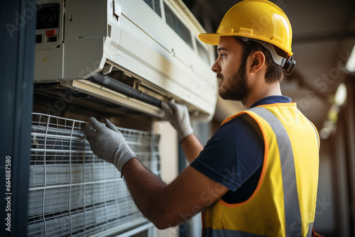 Skilled construction worker diligently installing an air conditioning unit on the wall inside an apartment. Ai generated