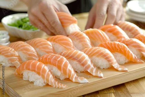 Skilled experienced japanese master chef preparing sushi rolls traditional cuisine restaurant bistro slicing fresh salmon fish tasty delicious gourmet dish seafood rice cook preparing order