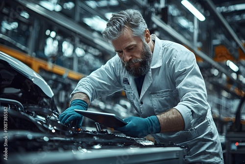 Skilled factory manager supervising production line tasks with tablet in hand, ensuring efficiency and quality in a modern industrial setting