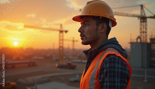 Skilled latin engineer observing construction progress during stunning sunset at urban site in evening hours