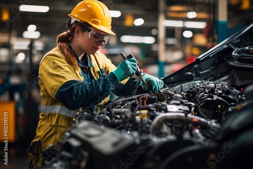 Skilled technician performs maintenance in a busy automotive workshop during daylight. Generative AI