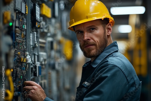 Skilled technician working on electrical equipment in a modern facility during evening hours
