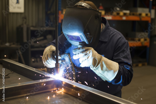 Skilled welder in protective gear sparks bright blue light while joining metal beams