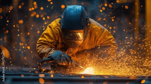 Skilled welder working in workshop, creating sparks with metal welding tool