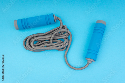 Skipping rope or jumping rope isolated on blue background. Selective focus and crop fragment