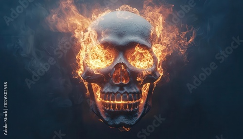 Skull on fire with smoke forming abstract shapes, dark and moody atmosphere, skull, smoke and fire