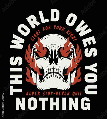 Skull with Flames Illustration and Slogan Artwork on Black Background For Apparel and Other Uses