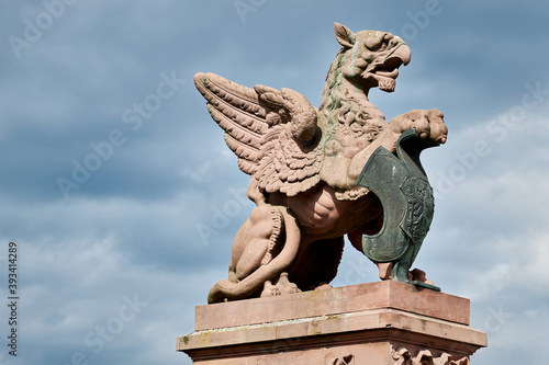 Skulptur eines Greifen mit Wappenschild am südöstlichen Ende der denkmalgeschützten Moltkebrücke in Berlin-Mitte