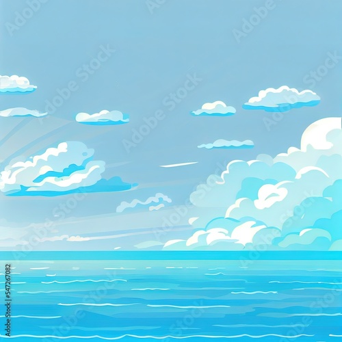 Sky and sun at sea background, ocean and beach 2d illustrated island scenery empty flat cartoon. Ocean or sea water with waves and clouds in sky, summer blue seascape with cloudy sky and seaside