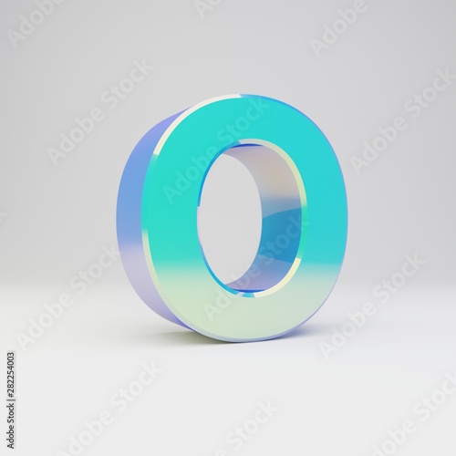 Sky blue 3d letter O uppercase. Metal font with glossy reflections and shadow isolated on white background.