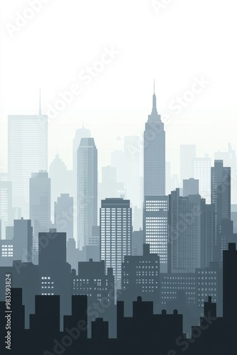Skyline of a modern city featuring skyscrapers in shades of grey depicted in a flat style 2D cartoon illustration
