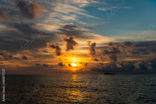 Skyscape with sea sunrise. Peaceful horizon at sea nature. Romantic summer vacation on beach seascape. Sunrise sky horizon. Sea sunset view. Cloudy sunset sky and seascape at summer vacation